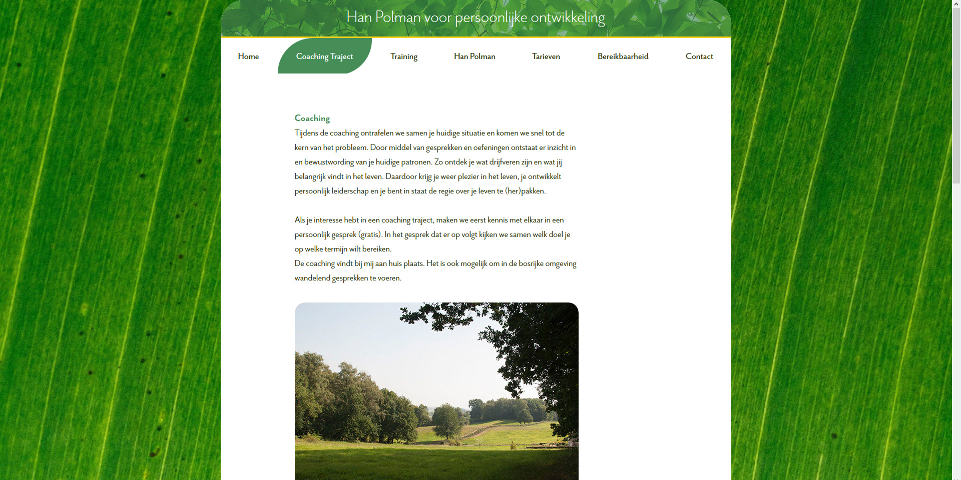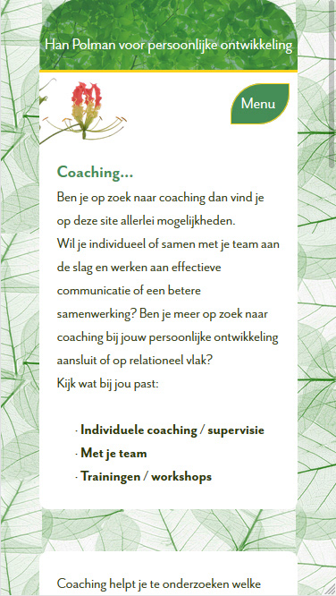 Voor Han Polman, coach voor persoonlijke ontwikkeling, maakte ik een website. De volgende elementen wilde hij graag terug zien: rust, zijn lievelingsbloemen, planten, foto's van de bosrijke omgeving waar hij wandelend coaching sessies geeft en foto's van de praktijk aan huis. Wit en verschillende tinten groen doorbroken met oranje en geel.